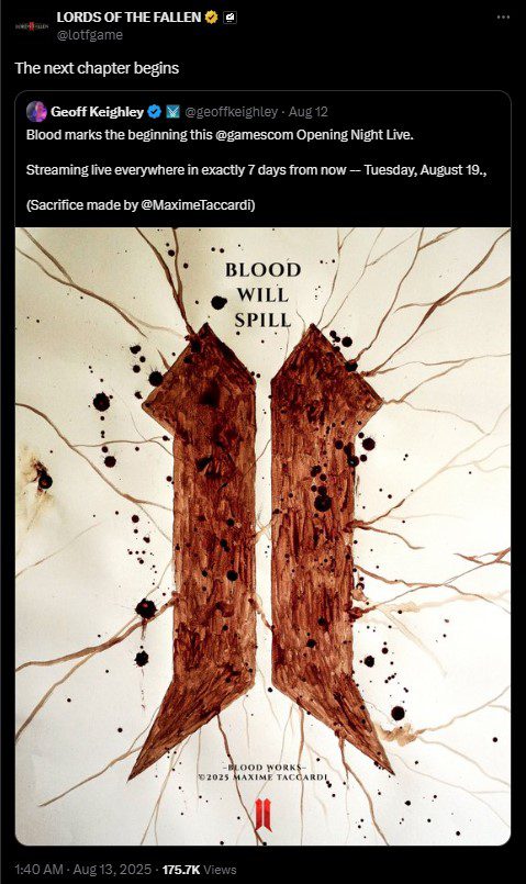 CI Games unveiled the Lords of the Fallen II trailer at Gamescom Opening Night Live, reaching 72 million viewers worldwide, but ahead of the kickoff event, the developer connected with its host Geoff Keighley to tease the new game on social media. He shared a “Blood Will Spill” promo image that was created by French artist Maxime Taccardi, who paints with his own blood, and the technique was used for the game’s veiny “II” logo painting.