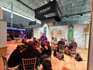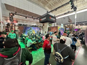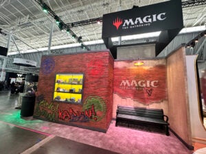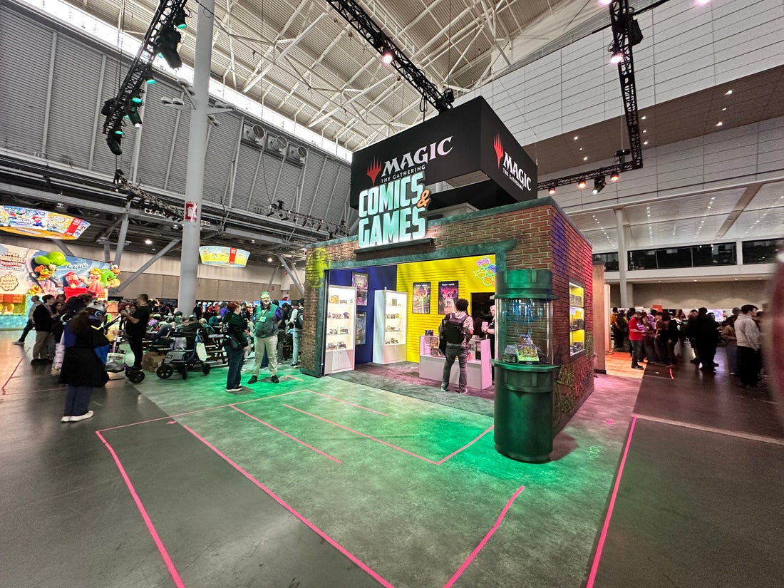 Magic: The Gathering was back with a multisided booth offering numerous touchpoints for attendees to interact with and learn about the popular trading card game. At the front, attendees could enter the School of Mages from the soon-to-be-released Secrets of Strixhaven edition, as well as participate in a photo op, crack-a-pack challenges and a digital quiz to find out which Strixhaven College they belonged to. On the reverse side of the booth, they could learn to play Magic with the newly released “Teenage Mutant Ninja Turtles” edition or shop in the MTG store.