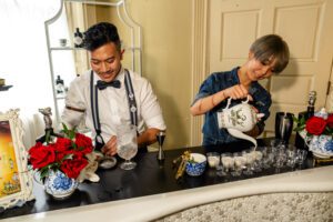 “It was taking inspiration points, but then filtering them through: What are they in our world?” Henderson says. “People are blindfolded and walk through the door and sit down, and once that blindfold comes off, it’s something they just don’t expect. It’s like, ‘We’re in a bedroom, but it’s all these little two-top tables with roses and centerpieces, and then there’s a bed in the middle of this room. There’s an alligator in the damn bed, and the alligator’s in cucumber pajamas. None of this makes sense—but again, it makes sense for Hendrick’s. And that’s the beauty of it, they’re willing to go on the ride with us.”