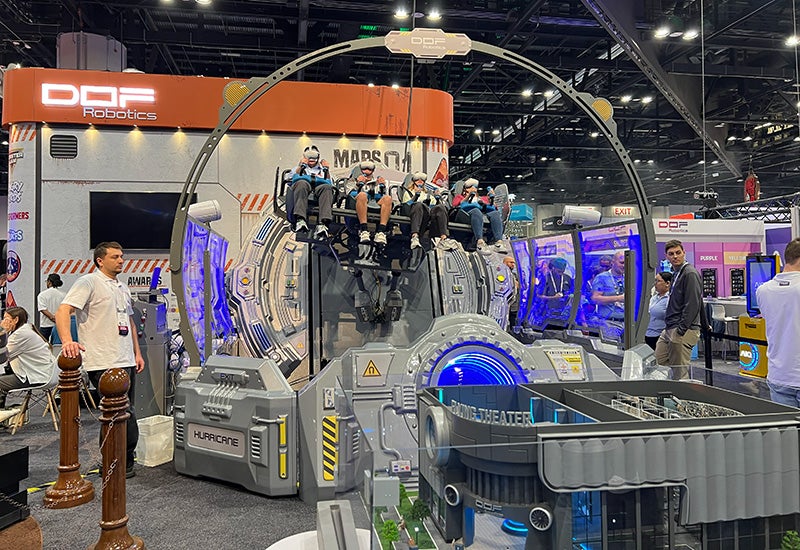 DOF Robotics offered two ride experiences in its booth: Mars Odyssey, a 270-degree immersive tunnel attraction, and the Hurricane 360 VR ride. The Istanbul-headquartered exhibitor also unveiled its new steampunk dark ride vehicle that was on display and spinning in its booth all week.