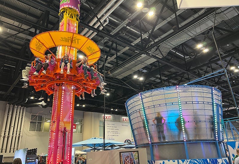 Zamperla debuted its new tower ride, WingZ, which also offers accessible seating for wheelchair users. By flapping their arms, riders can make their gondola rise and fall as the central tower slowly rotates. Italian manufacturer SBF–VISA Group brought its well-known, spinning figure-eight roller coaster and drop tower that had attendees’ screams echoing across the convention center.