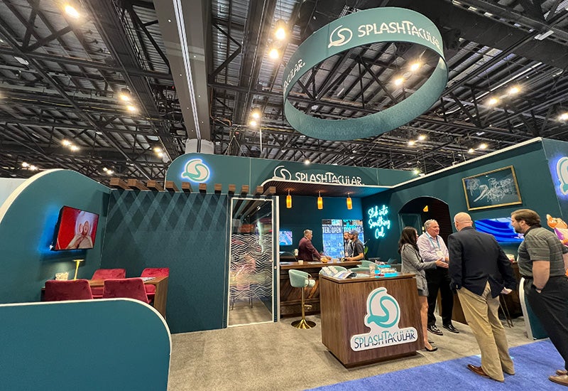 Also a Brass Ring Exhibitor Award winner, first place in the 600-1,200-square-foot booth category, SplashTacular made a splash with its upscale, water-inspired lounge. The water slide manufacturer drew us in with a neon “Slink into Something Cool” sign, and the space was marked by ornate gold details, mood lighting, curved architecture, and plush couches and seating. A private conference room was enclosed by glass walls with wave patterns, and around the back of the booth was a two-story brick façade covered in an array of water park and ocean-themed posters, as well as a spray-painted SplashTacular logo. (Build: E3 XPS)